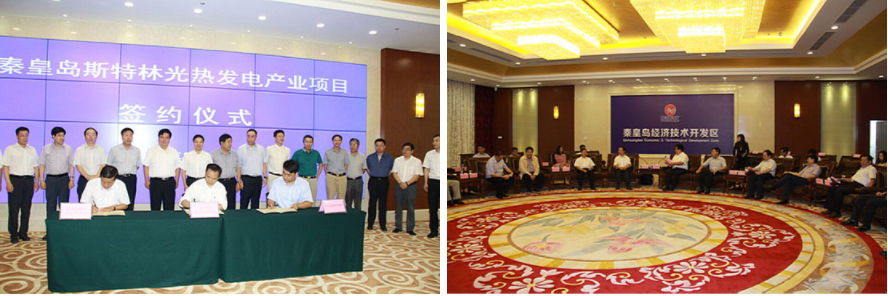 8月12日,秦皇岛森源投资集团、秦皇岛经济技术开发区、北京大学数字中国研究院、三方签署投资合作协议,斯特林光热发电产业项目正式落户秦皇岛开发区。市领导张瑞书、杨长新、张锋等出席项目签约仪式。项目总投资约12.5亿元,建设周期3至5年,建筑面积约10万平方米,主要建设发动机总装生产线、发动机测试生产线和发动机关键零部件生产线。项目达产后,年可实现产值45亿元、税收4亿元。