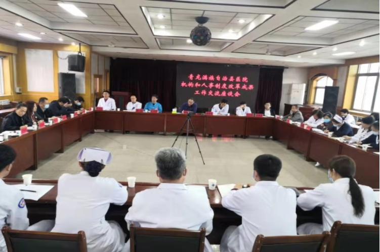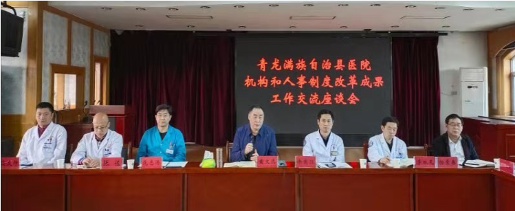 4月24日下午,青龙满族自治县医院机构和人事制度改革成果工作交流座谈会在门诊六楼会议室召开。森源集团董事长黄文选出席会议并与竞聘上岗人员进行了面对面的交流;森源集团医管团队、医院竞聘上岗的院领导和中层干部共50余人参加了座谈会。