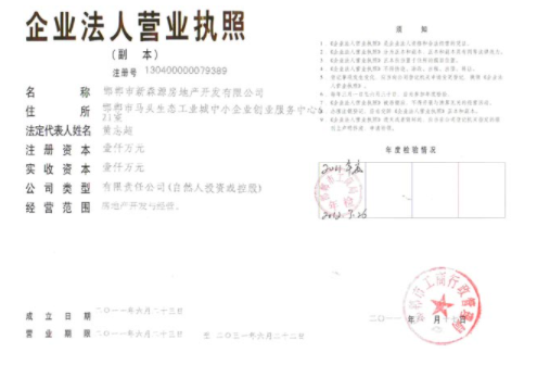 马头旧城改造项目的筹备工作进入第二年,在开发区有关部门的大力配合下,森源地产邯郸项目部于2011年6月23日正式取得企业法人营业执照,公司名称为:邯郸市新森源房地产开发有限公司。