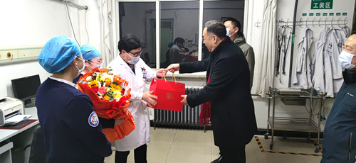 当晚,森源集团董事长黄文选及医管团队成员带着鲜花和礼品,来到医院看望慰问节日期间坚守岗位的员工,为大家送来了新春祝福和节日问候。医院总支书记李书中、总支副书记院长徐国江及院班子成员陪同慰问。