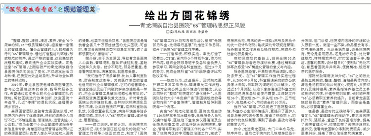 “整理、整顿、清扫、清洁、素养、安全”6个简单的词,12个极易理解的字,涵盖着一套强大的管理理念。懂企业管理的人大都知道风行的“6S”管理理念,通过打造整洁的环境,形成规范的秩序,通过严格的管理,达到高效的流程和模式,最终提升企业实效实绩。正是这套“6S”管理,让濒临破产的青龙满族自治县医院悄然间发生了变化,不仅迸发出活力与热情,还质变为效益与盈利,升华为全体职工的精神动能。