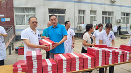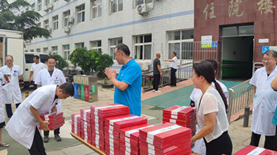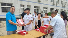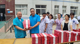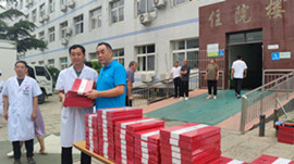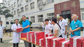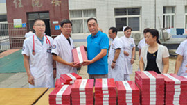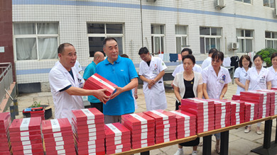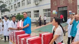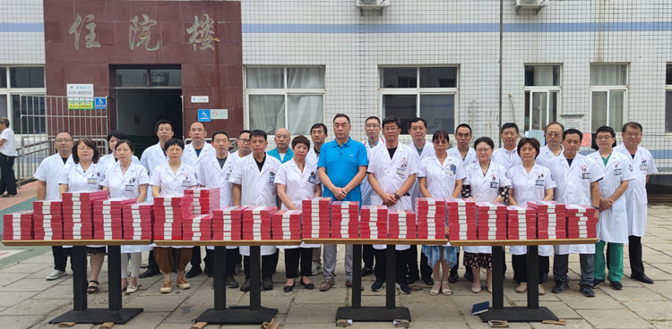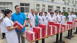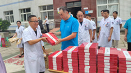 住院楼前黄文选董事长为每位医师亲自发放集团精心准备的刻有医师姓名的精美礼品,并与医师代表们亲切握手并致以节日的问候。