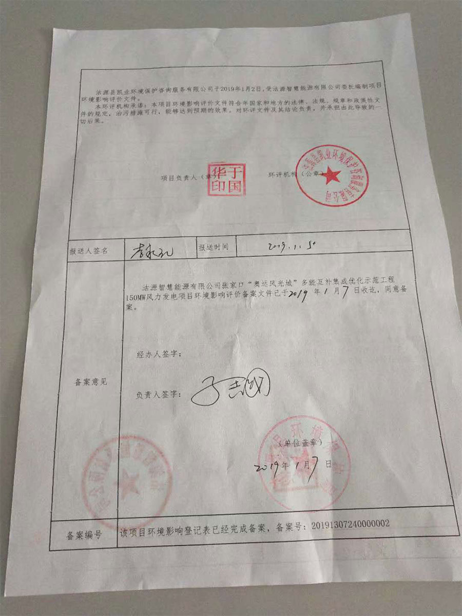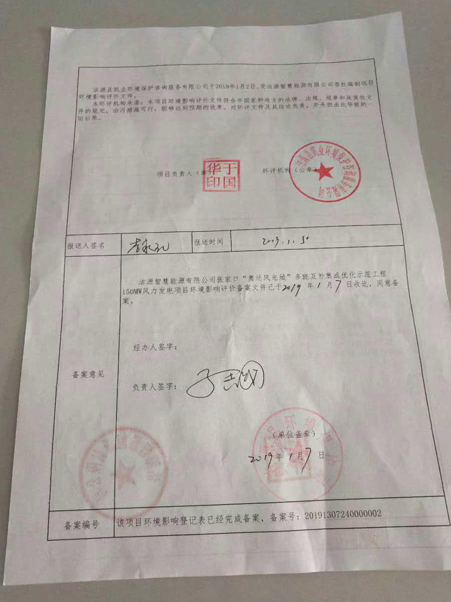 2019年1月7日我公司风电项目环评登记表获取环保局备案文件
