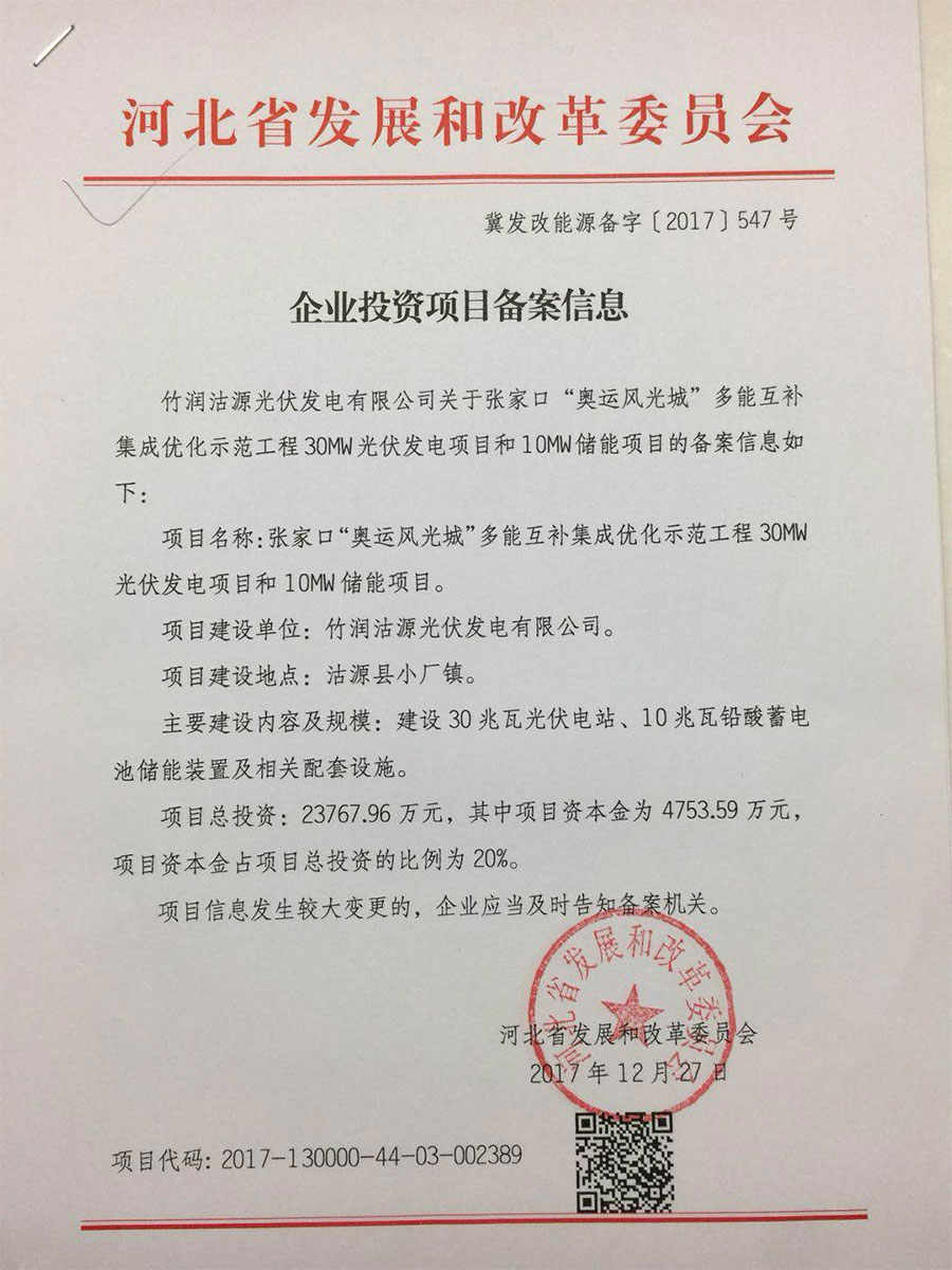张家口“奥运风光城”多能互补集成优化示范项目获得河北省发改委投资项目备案