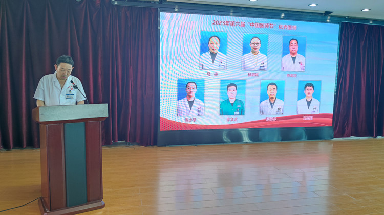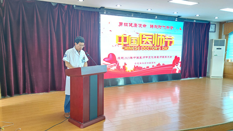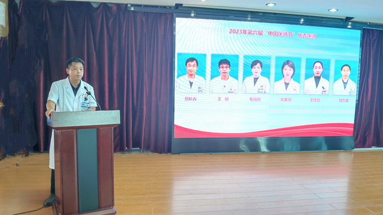 徐国江院长在表彰大会上致辞,向全院医务工作者致以节日问候,向获评的优秀医师表示热烈祝贺。徐国江院长向全体医师提三点希望:一是统一思想,全力支持医院各项改革;二是刻苦钻研,努力学习,不断提高专业技术能力;三是加强医德医风建设,弘扬高尚医德。继续弘扬“敬佑生命、救死扶伤、甘于奉献、大爱无疆”的职业精神,坚守从医初心,铸就医者使命,践行医者誓言,做德医双馨的医务工作者,为全县人民健康做出更大的贡献。