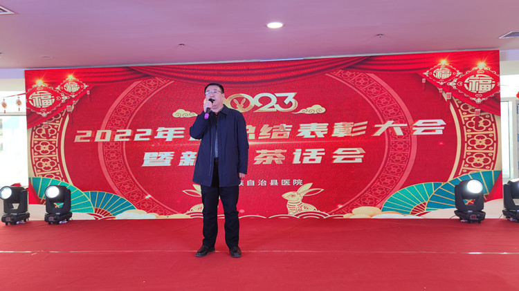 上图为青龙县医院2022年度总结表彰大会暨新春茶话会上县政府副县长县医院党总支书记高志山致辞