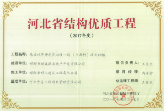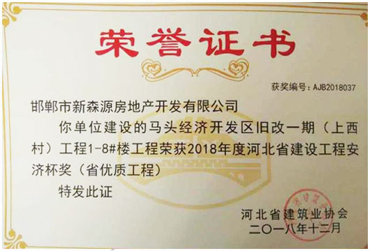 依托秦皇带森源投资集团的强大支撑,经过8年的长期努力,邯郸市新森源公司的发展取得了历史性成就,共完成投资13亿元,建筑面积20万平方米。先后获得邯郸市优质结构2项、邯郸市市级文明工地2项、邯郸市市级优质工地2项、邯郸市观摩工程、邯郸市优秀房地产开发企业等市级荣誉称号。先后获得河北省省级文明工地2项、河北省省级优质结构2项、河北省省级优质工程2项、河北省房地产行业“燕赵广厦”杯、河北省房地产行业推荐品牌企业(连续2年)、河北省房地产行业突出贡献个人等省级荣誉称号。