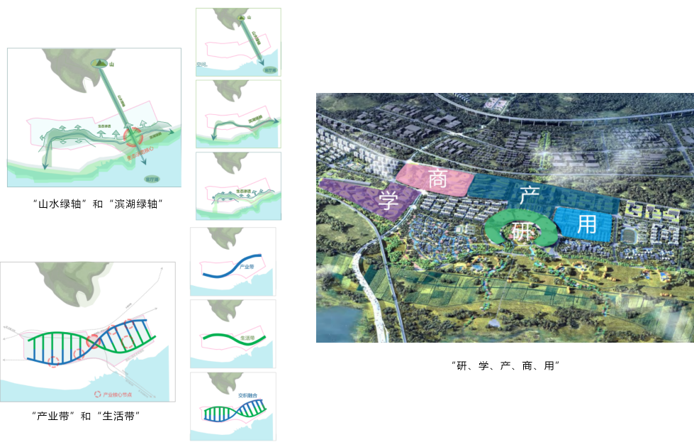 两带:“产业带”和“生活带”,以双螺旋结构呈现产城交织,共生融合,依托生活圈理念,实现人本服务;