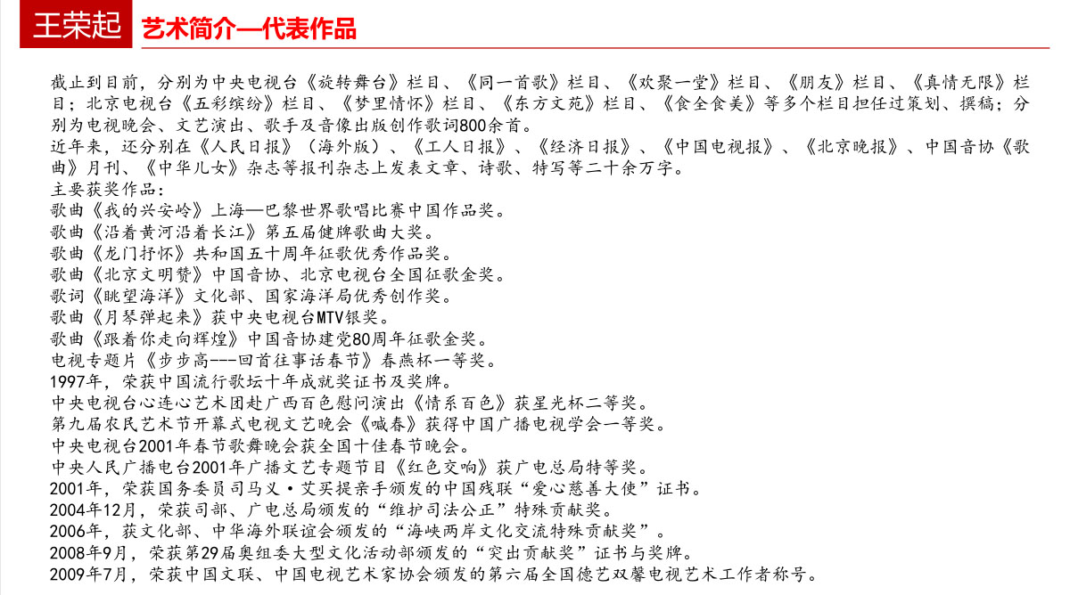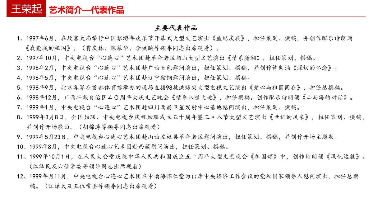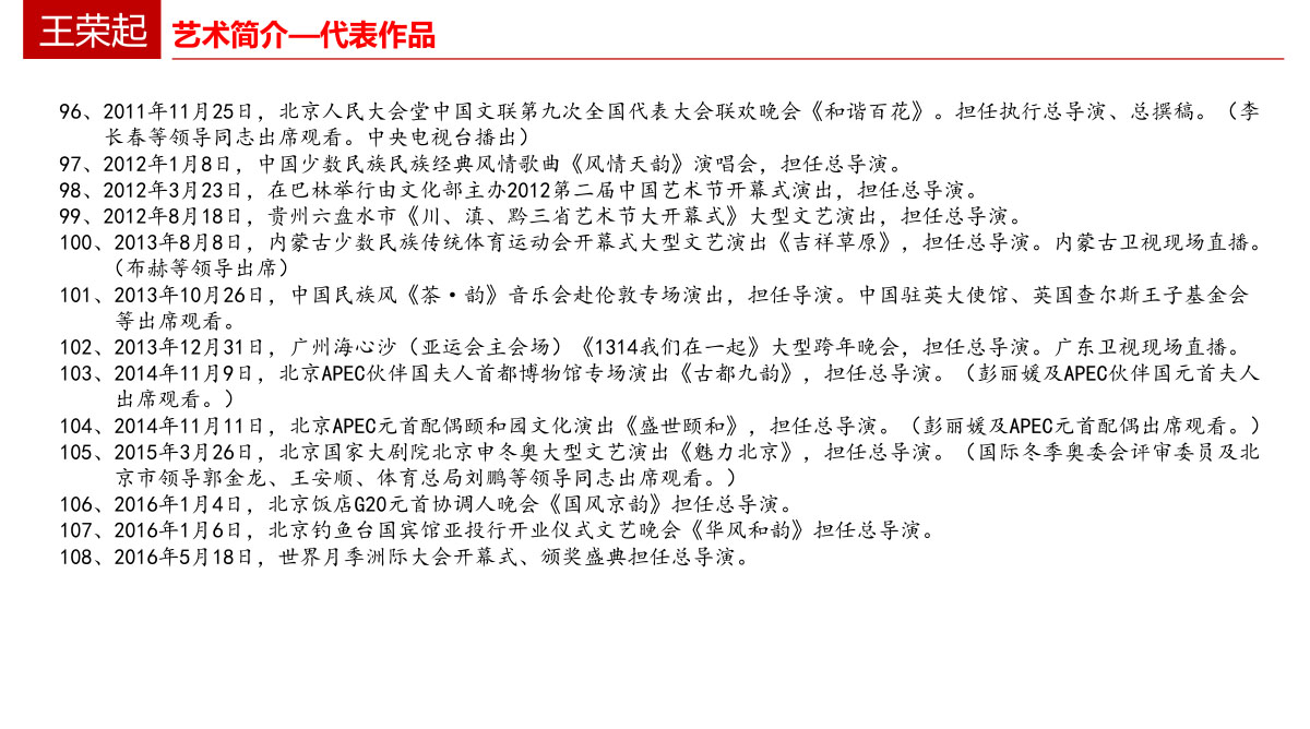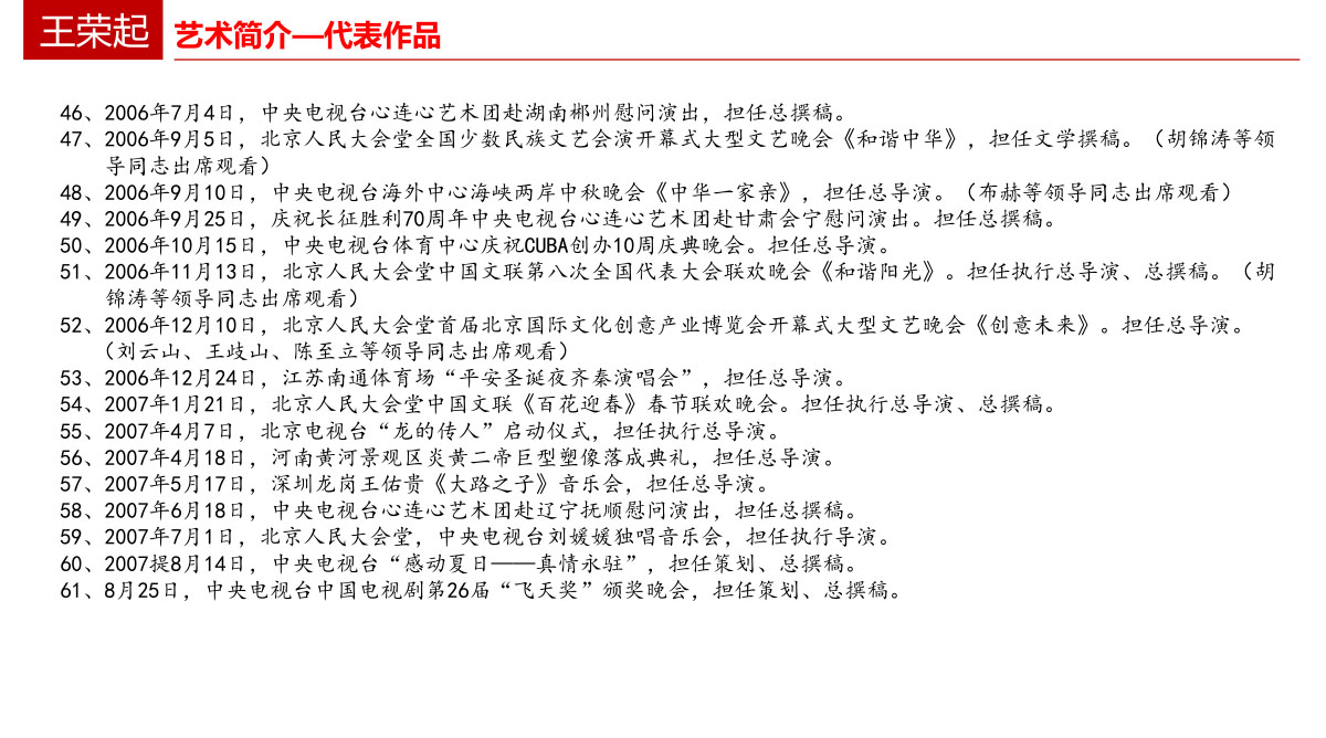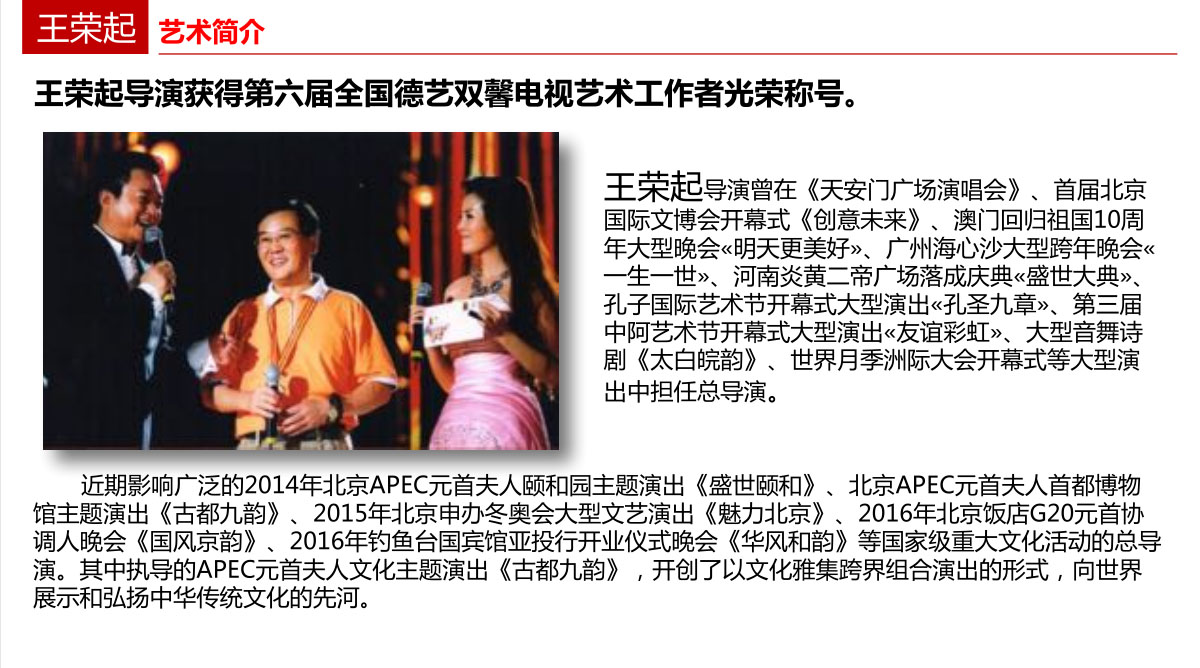 著名导演、策划人。国家一级词作家,第六届全国德艺双馨电视艺术工作者,中国电视艺术家协会理事,《中华儿女》杂志编委。中央电视台心连心艺术团总撰稿。现任北京语言大学国际文化创意中心主任。2014年APEC元首夫人颐和园演出《盛世颐和》总导演、2014年APEC元首夫人首都博物馆演出《古都九韵》总导演,2015北京国家大剧院申办冬奥会大型演出《魅力北京》总导演、中央一套直播《共筑中国梦》总导演、2016年北京饭店金色大厅举办的20国G20元首协调人晚会《京韵风采》和钓鱼台国宾馆习近平出席的57国财长参加的亚投行开行演出《国风和韵》总导演,2017年“一带一路”国际合作高峰论坛元首配偶故宫文化展演活动《丝韵春风》总导演,及指导过国家级大型晚会千余场,在业界享有很高声望。